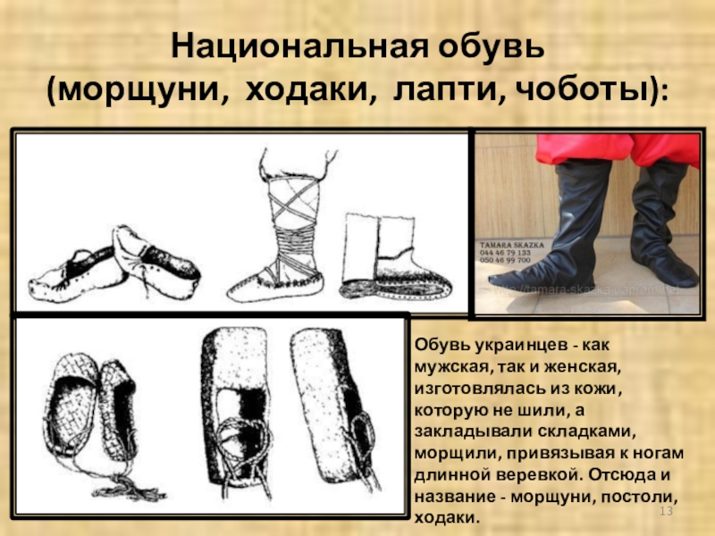 Слайд 13Национальная обувь (морщуни, ходаки, лапти, чоботы):