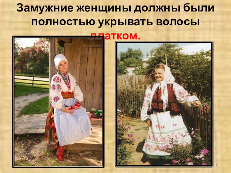 Слайд 11Замужние женщины должны были полностью укрывать волосы платком.
