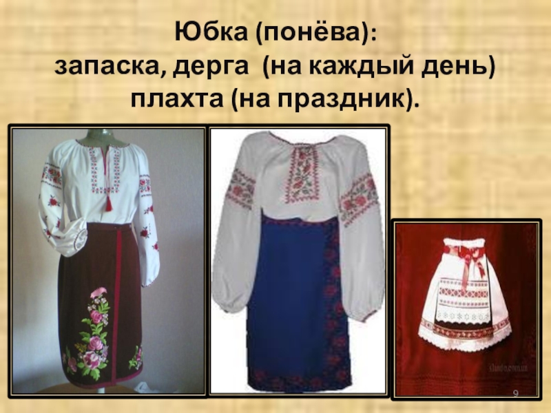 Слайд 9Юбка (понёва): запаска, дерга (на каждый день) плахта (на праздник).