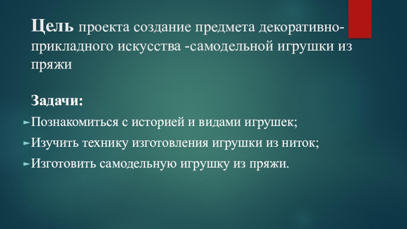 Цель проекта создание предмета декоративно-прикладного искусства -самодельной игрушки из пряжиЗадачи:Познакомиться с историей и видами игрушек;Изучить технику изготовления
