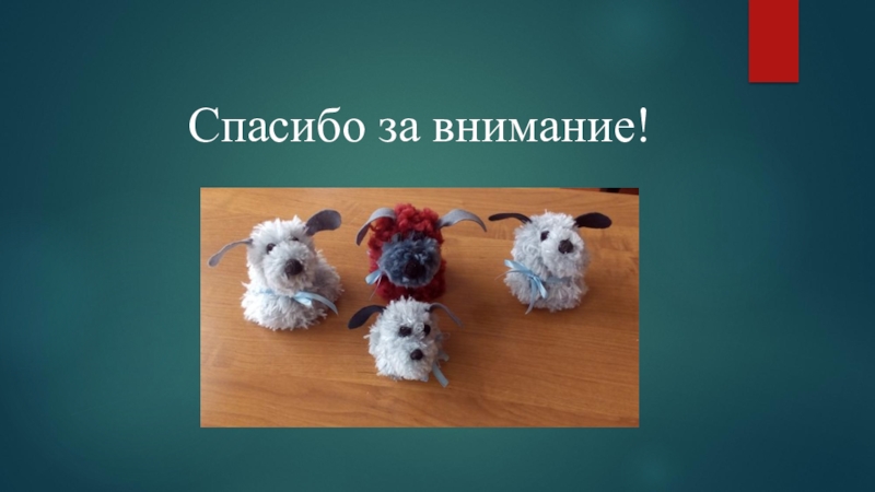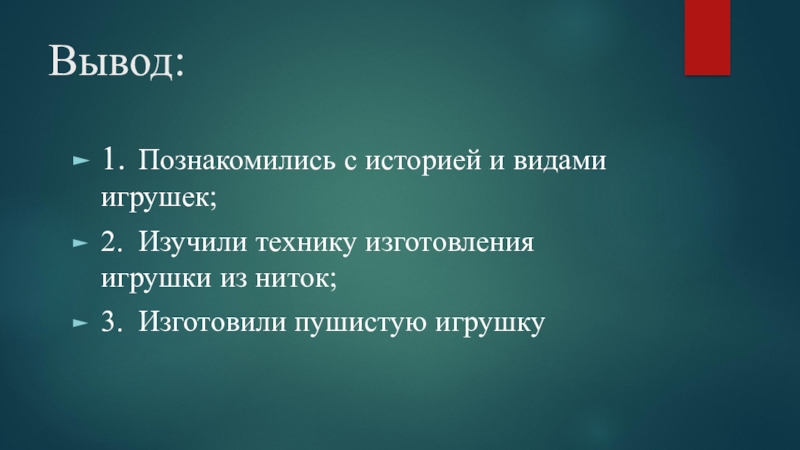 Вывод:1.	Познакомились с историей и видами игрушек;2.	Изучили технику изготовления игрушки из ниток;3.	Изготовили пушистую игрушку