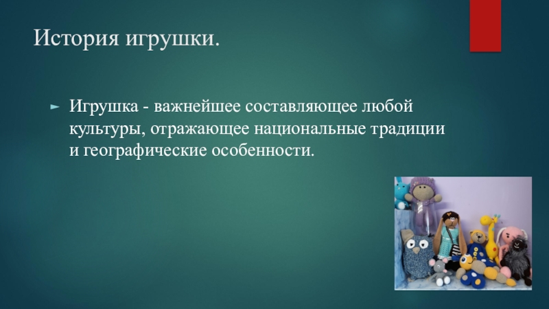 История игрушки.Игрушка - важнейшее составляющее любой культуры, отражающее национальные традиции и географические особенности.
