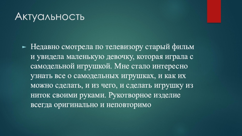 АктуальностьНедавно смотрела по телевизору старый фильм и увидела маленькую девочку, которая играла с самодельной игрушкой. Мне стало