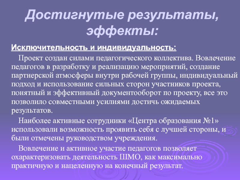 создан силами педагогического коллектива. Вовлечение педагогов в разработку и реализацию мероприятий, создание партнерской атмосферы внутри рабочей группы, индивидуальный подход и использование сильных сторон участников проекта, понятный и эффективный документооборот по проекту, все это позволило совместными усилиями достичь ожидаемых результатов.