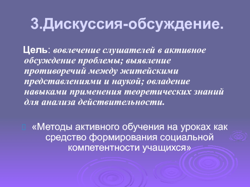 Цель: вовлечение слушателей в активное обсуждение проблемы; выявление противоречий
