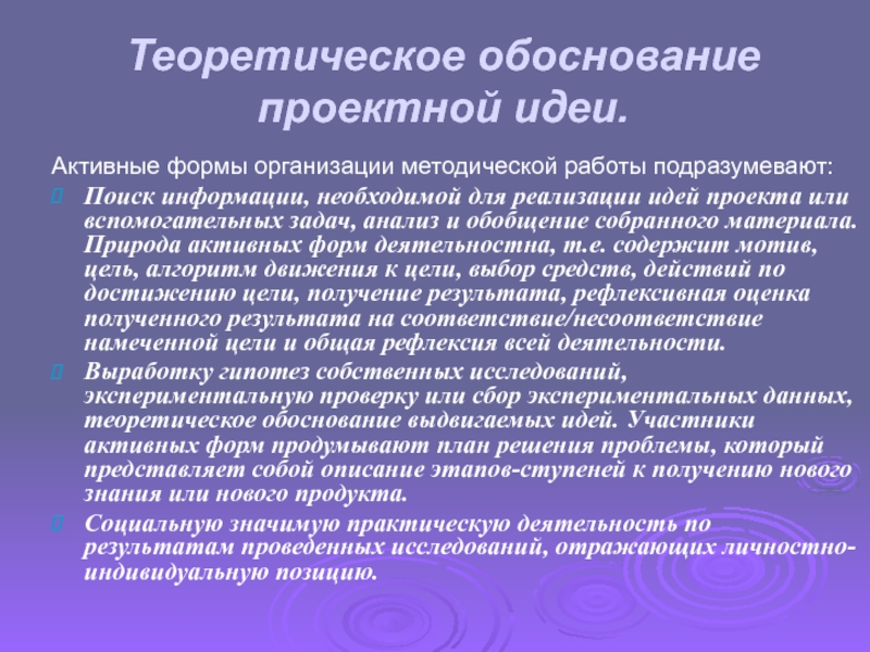 необходимой для реализации идей проекта или вспомогательных задач, анализ и обобщение собранного материала. Природа активных форм деятельностна, т.е. содержит мотив, цель, алгоритм движения к цели, выбор средств, действий по достижению цели, получение результата, рефлексивная оценка полученного результата на соответствие/несоответствие намеченной цели и общая рефлексия всей деятельности.