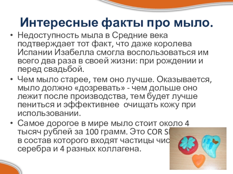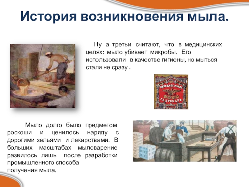 Мыло долго было предметом роскоши и ценилось наряду с дорогими зельями и лекарствами. В больших масштабах мыловарение развилось лишь после разработки промышленного способа