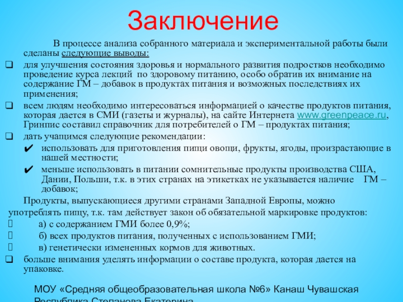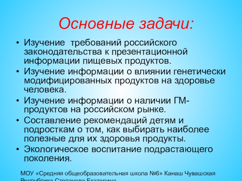 углубленное изучение особенностей влияния генетически модифицированных продуктов на организм человека и окружающую среду, а также изучение технологии отображения информации об этом в презентационной структуре продуктов в соответствии с законом РФ «О защите прав потребителей».