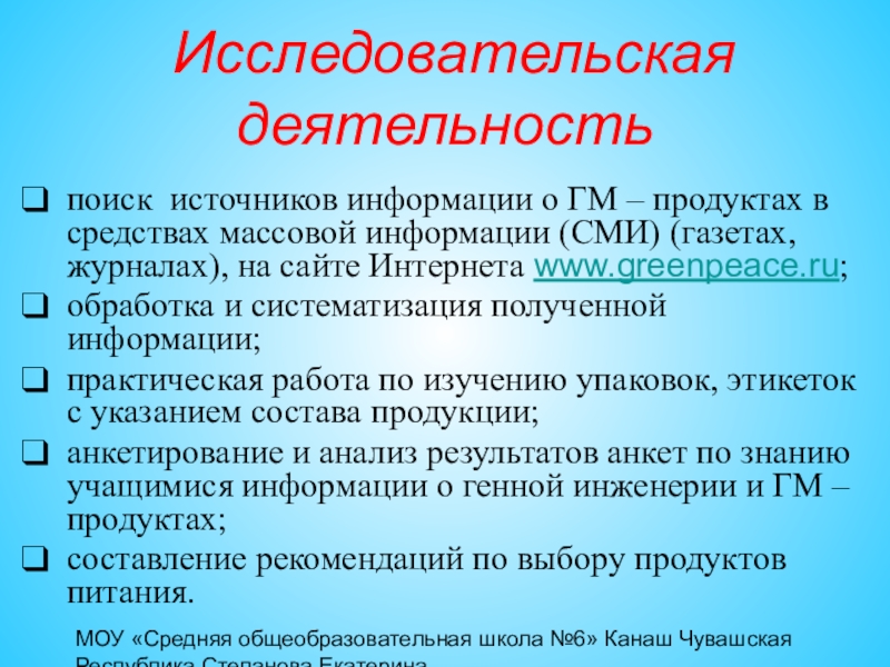 поиск источников информации о ГМ – продуктах в средствах массовой информации (СМИ) (газетах, журналах), на сайте Интернета www.greenpeace.ru;