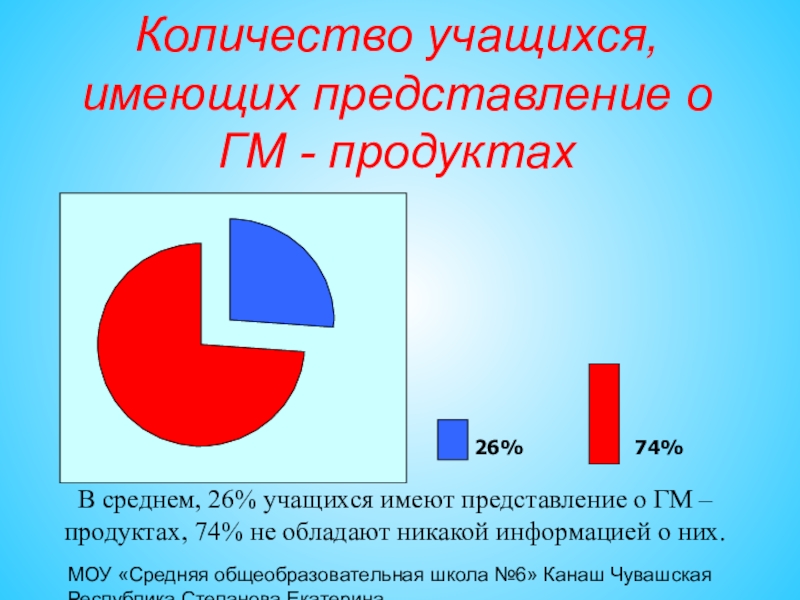 В среднем, 26% учащихся имеют представление о ГМ – продуктах, 74% не обладают никакой информацией о них.