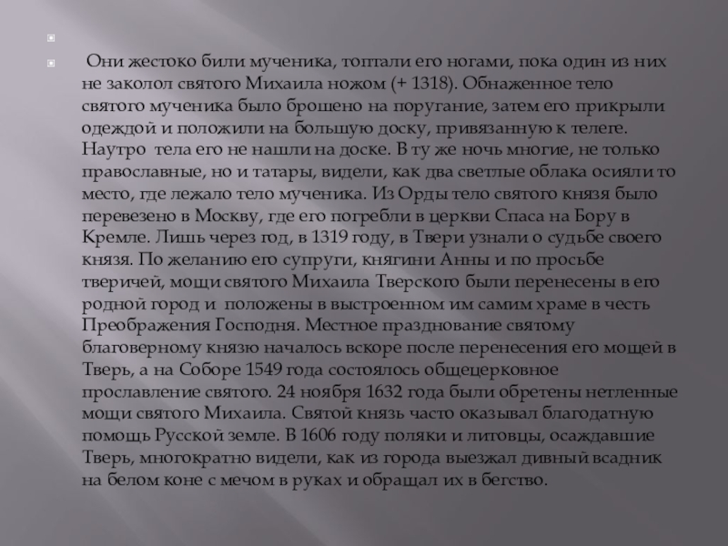 один из них не заколол святого Михаила ножом (+ 1318). Обнаженное тело святого мученика было брошено на поругание, затем его прикрыли одеждой и положили на большую доску, привязанную к телеге. Наутро тела его не нашли на доске. В ту же ночь многие, не только православные, но и татары, видели, как два светлые облака осияли то место, где лежало тело мученика. Из Орды тело святого князя было перевезено в Москву, где его погребли в церкви Спаса на Бору в Кремле. Лишь через год, в 1319 году, в Твери узнали о судьбе своего князя. По желанию его супруги, княгини Анны и по просьбе тверичей, мощи святого Михаила Тверского были перенесены в его родной город и положены в выстроенном им самим храме в честь Преображения Господня. Местное празднование святому благоверному князю началось вскоре после перенесения его мощей в Тверь, а на Соборе 1549 года состоялось общецерковное прославление святого. 24 ноября 1632 года были обретены нетленные мощи святого Михаила. Святой князь часто оказывал благодатную помощь Русской земле. В 1606 году поляки и литовцы, осаждавшие Тверь, многократно видели, как из города выезжал дивный всадник на белом коне с мечом в руках и обращал их в бегство.