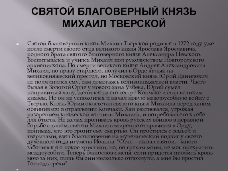 1272 году уже после смерти своего отца великого князя Ярослава Ярославича, родного брата святого благоверного князя Александра Невского. Воспитывался и учился Михаил под руководством Новгородского архиепископа. По смерти великого князя Андрея Александровича Михаил, по праву старшего, получил в Орде ярлык на великокняжеский престол, но Московский князь Юрий Данилович не подчинился ему, сам домогаясь великокняжеской власти. Часто бывая в Золотой Орде у нового хана Узбека, Юрий сумел понравиться хану, женился на его сестре Кончаке и стал великим князем. Но он не успокоился и начал новую междоусобную войну с Тверью. Князь Юрий оклеветал святого князя Михаила перед ханом, обвинив его в отравлении Кончаки. Хан разгневался, угрожая разорением княжеской вотчины Михаила, и потребовал его к себе для ответа. Не желая проливать кровь русских воинов в неравной борьбе с ханом, святой Михаил смиренно отправился в Орду, понимая, что это грозит ему смертью. Он простился с семьей и тверичами, взял благословение на мученический подвиг у своего духовного отца игумена Иоанна. "Отче, - сказал святой, - много заботился я о покое христиан, но, по грехам моим, не мог прекратить междоусобий. Теперь благослови меня, если придется пролить кровь мою за них, лишь бы они несколько отдохнули, а мне бы простил Господь грехи".