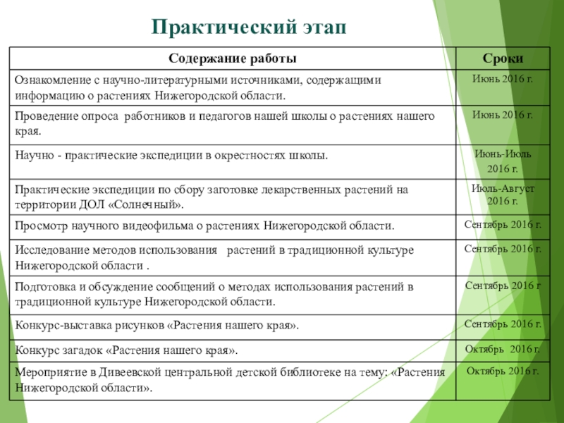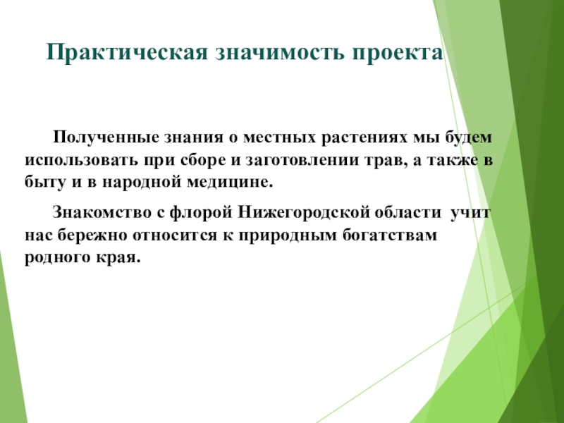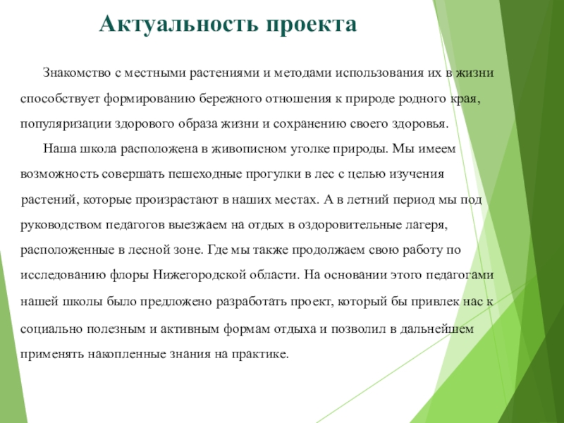 растений, которые произрастают в наших местах. А в летний период мы под руководством педагогов выезжаем на отдых в оздоровительные лагеря, расположенные в лесной зоне. Где мы также продолжаем свою работу по исследованию флоры Нижегородской области. На основании этого педагогами нашей школы было предложено разработать проект, который бы привлек нас к социально полезным и активным формам отдыха и позволил в дальнейшем применять накопленные знания на практике.