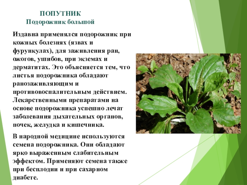 для заживления ран, ожогов, ушибов, при экземах и дерматитах. Это объясняется тем, что листья подорожника обладают ранозаживляющим и противовоспалительным действием. Лекарственными препаратами на основе подорожника успешно лечат заболевания дыхательных органов, почек, желудка и кишечника.