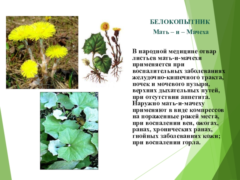 применяется при воспалительных заболеваниях желудочно-кишечного тракта, почек и мочевого пузыря, верхних дыхательных путей, при отсутствии аппетита. Наружно мать-и-мачеху применяют в виде компрессов на пораженные рожей места, при воспалении вен, ожогах, ранах, хронических ранах, гнойных заболеваниях кожи; при воспалении горла.