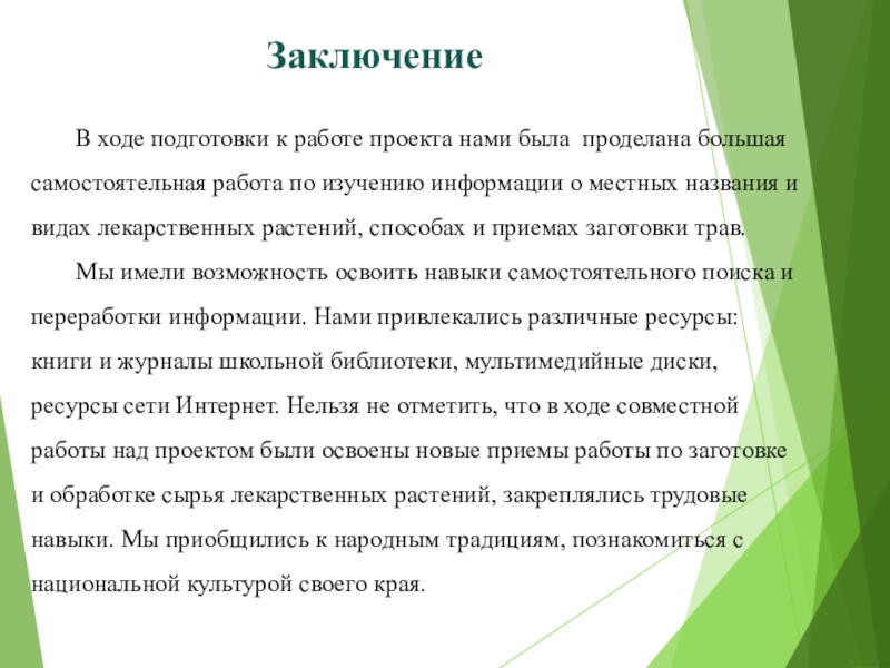 Мы имели возможность освоить навыки самостоятельного поиска и переработки информации. Нами привлекались различные ресурсы: книги и журналы школьной библиотеки, мультимедийные диски, ресурсы сети Интернет. Нельзя не отметить, что в ходе совместной работы над проектом были освоены новые приемы работы по заготовке и обработке сырья лекарственных растений, закреплялись трудовые навыки. Мы приобщились к народным традициям, познакомиться с национальной культурой своего края.