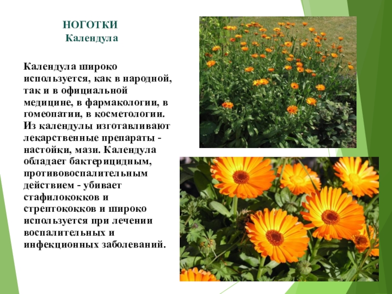 медицине, в фармакологии, в гомеопатии, в косметологии. Из календулы изготавливают лекарственные препараты - настойки, мази. Календула обладает бактерицидным, противовоспалительным действием - убивает стафилококков и стрептококков и широко используется при лечении воспалительных и инфекционных заболеваний.
