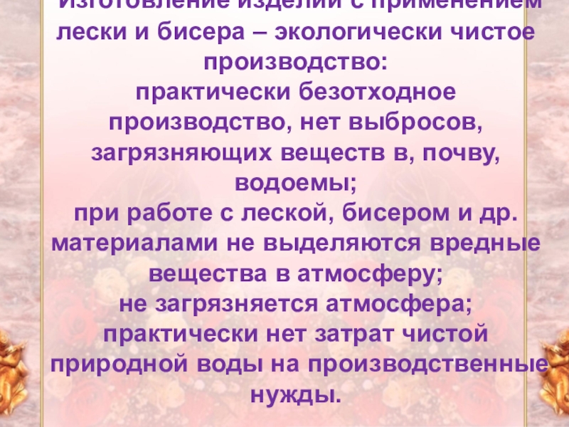 при работе с леской, бисером и др. материалами не выделяются вредные вещества в атмосферу;