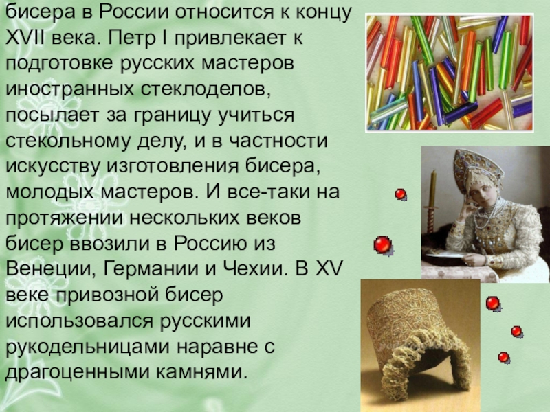 Первая попытка создать промышленное производство бисера в России относится к концу XVII века. Петр I привлекает к подготовке русских мастеров иностранных стеклоделов, посылает за границу учиться стекольному делу, и в частности искусству изготовления бисера, молодых мастеров. И все-таки на протяжении нескольких веков бисер ввозили в Россию из Венеции, Германии и Чехии. В XV веке привозной бисер использовался русскими рукодельницами наравне с драгоценными камнями.
