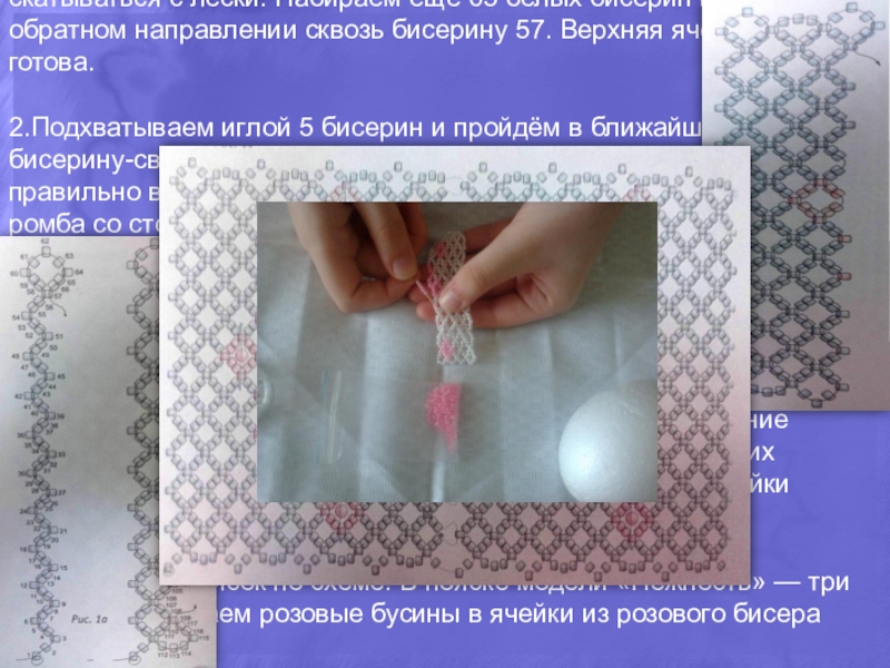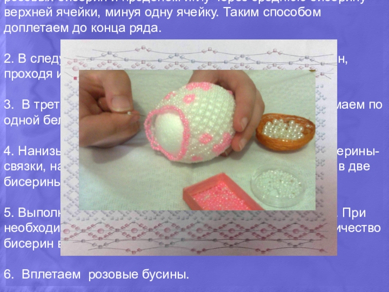 2. В следующем ряду подплетаем по 5 розовых бисерин, проходя иглой в каждую бисерину-связку.