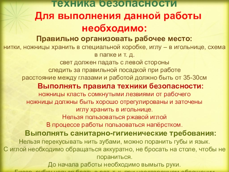 Бисер, рубку нельзя брать в рот, т. к. при неосторожном обращении материалы могут попасть в верхние дыхательные пути