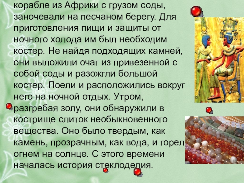 Стеклоделие было изобретено около 4-го тысячелетия до нашей эры. Существует легенда об этом важном для человечества событии. В ней рассказывается о том, что финикийские купцы, возвращаясь на корабле из Африки с грузом соды, заночевали на песчаном берегу. Для приготовления пищи и защиты от ночного холода им был необходим костер. Не найдя подходящих камней, они выложили очаг из привезенной с собой соды и разожгли большой костер. Поели и расположились вокруг него на ночной отдых. Утром, разгребая золу, они обнаружили в кострище слиток необыкновенного вещества. Оно было твердым, как камень, прозрачным, как вода, и горело огнем на солнце. С этого времени началась история стеклоделия.