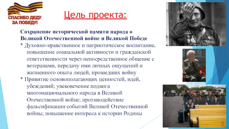 Цель проекта:Сохранение исторической памяти народа о Великой Отечественной войне и Великой Победе* Духовно-нравственное и патриотическое воспитание, повышение социальной активности и гражданской ответственности через непосредственное общение с ветеранами, передачу ими личных ощущений и жизненного опыта людей, прошедших