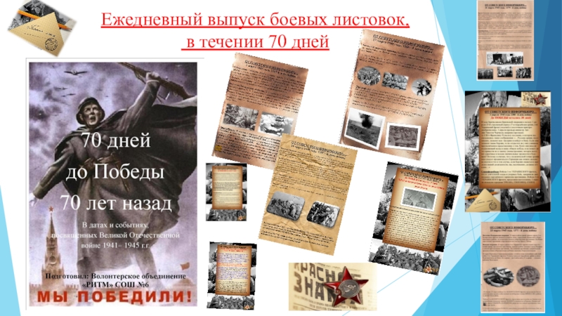 Ежедневный выпуск боевых листовок в течении 70 дней. Где каждый день рассказывалось о тех боях и победах наших солдат в Великой Отечественной войне. О их героическом подвиге в освобождении страны от немецких захватчиков.