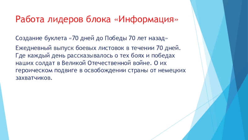 Работа лидеров блока «Информация» Создание буклета «70 дней до Победы 70 лет назад»Ежедневный выпуск боевых листовок в