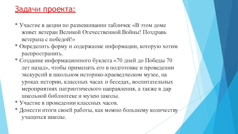 Задачи проекта:* Участие в акции по развешивании табличек «В этом доме живет ветеран Великой Отечественной Войны! Поздравь