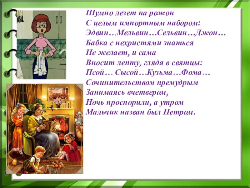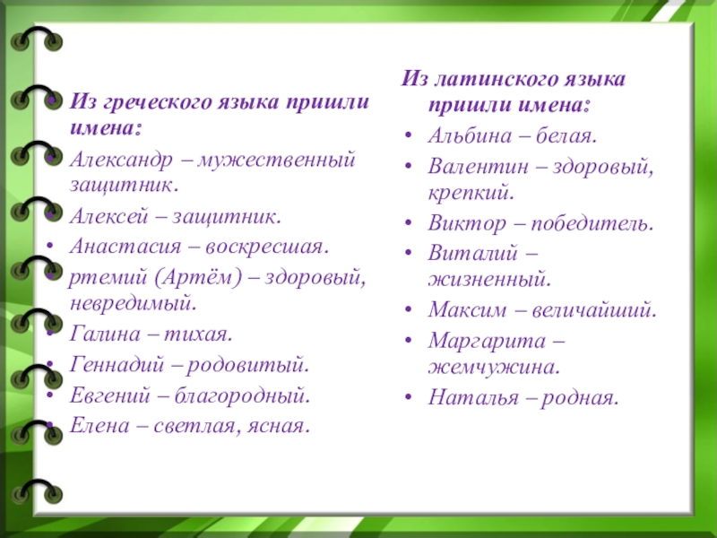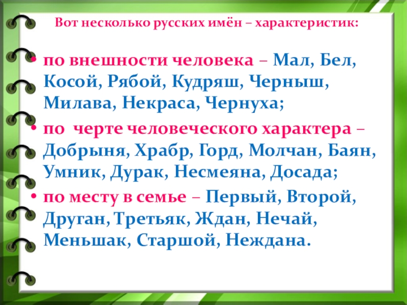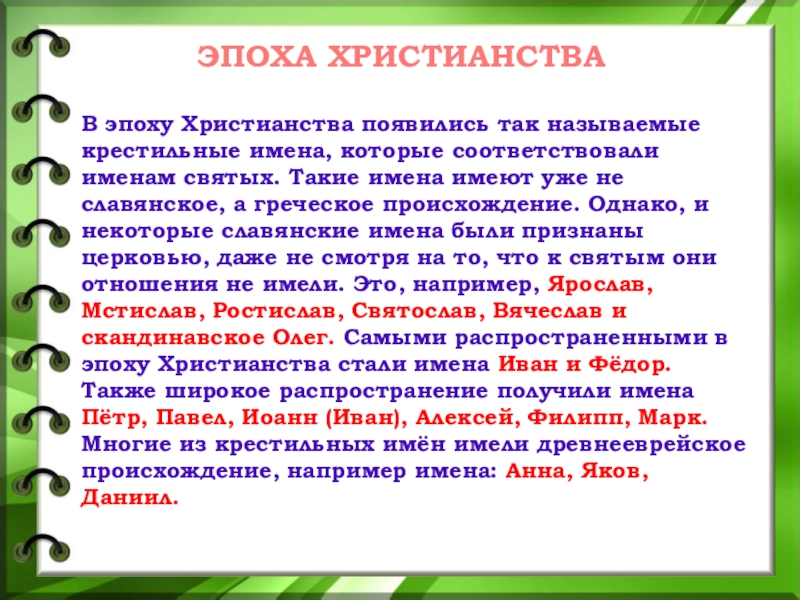 именам святых. Такие имена имеют уже не славянское, а греческое происхождение. Однако, и некоторые славянские имена были признаны церковью, даже не смотря на то, что к святым они отношения не имели. Это, например, Ярослав, Мстислав, Ростислав, Святослав, Вячеслав и скандинавское Олег. Самыми распространенными в эпоху Христианства стали имена Иван и Фёдор. Также широкое распространение получили имена Пётр, Павел, Иоанн (Иван), Алексей, Филипп, Марк. Многие из крестильных имён имели древнееврейское происхождение, например имена: Анна, Яков, Даниил.