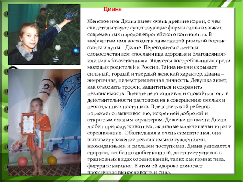 формы слова в языках современных народов европейского континента. В мифологии имя восходит к знаменитой римской богине охоты и луны – Диане. Переводится с латыни словосочетанием «посланница здоровья и благодеяния» или как «божественная». Является востребованным среди молодых родителей в России. Тайна имени скрывает сильный, гордый и твердый женский характер. Диана – энергичная, целеустремленная личность. Девушка знает, как отвоевать трофеи, защититься и сохранить независимость. Внешне неторопливая и спокойная, она в действительности расположена к совершению смелых и неожиданных поступков. В детстве такой ребенок поражает отзывчивостью, искренней добротой и открытым смелым характером. Девочка по имени Диана любит природу, животных, активные мальчишечьи игры и соревнования. Обаятельная и очень симпатичная, она вызывает уважение независимыми суждениями, неожиданными и смелыми поступками. Диана увлекается спортом, особенно любит конный, достигает успехов в грациозных видах соревнований, таких как гимнастика, фигурное катание. В этом ей здорово помогает врожденная выносливость и сила.