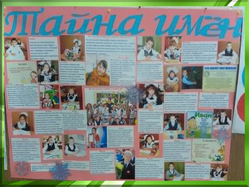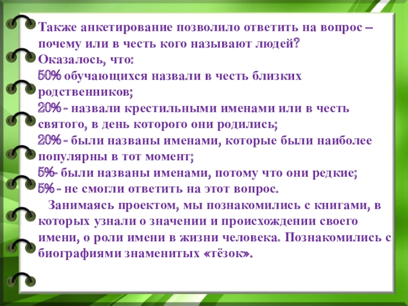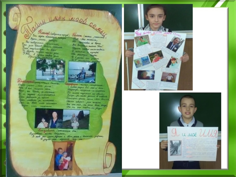 мы узнавали историю своего рода, потому как многие носят имена своих бабушек, дедушек, дядей и тёть. Было проведено анкетирование, в ходе которого выявились такие результаты. 95% учащихся не знают историю своего имени, а 5% знают поверхностно. Как и почему назвали так их, они не знают.