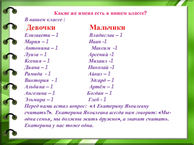 Перед нами встал вопрос: «А Екатерину Яковлевну считать?». Екатерина Яковлевна всегда нам говорит: «Мы- одна семья, мы должны жить дружно», а значит считать. Екатерина у нас тоже одна.