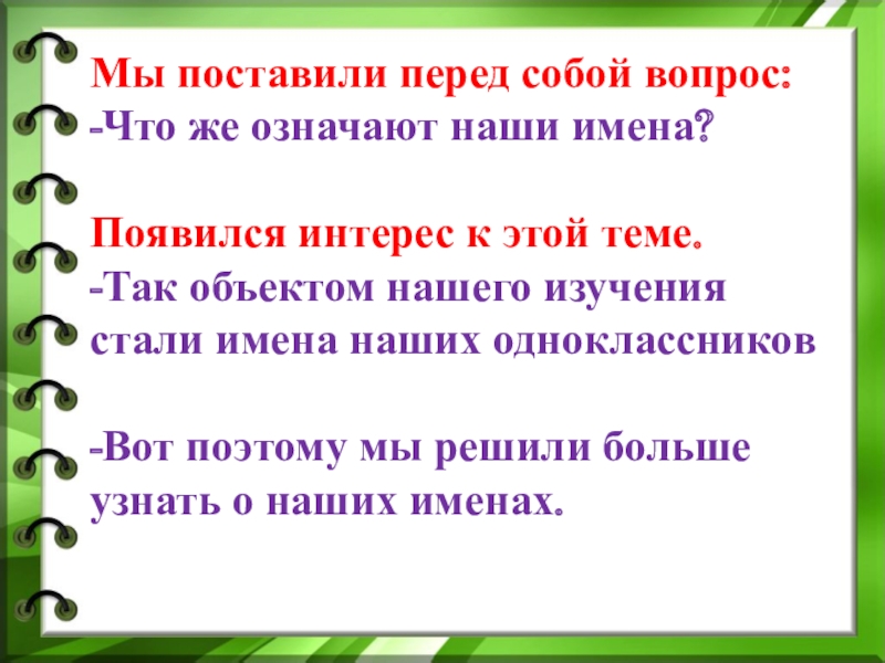 Нам стало интересно, о чём думают родители, когда дают ребёнку имя? А почему нас так назвали? Об этом мы спросили у наших родителей. Нам захотелось узнать больше о наших именах.