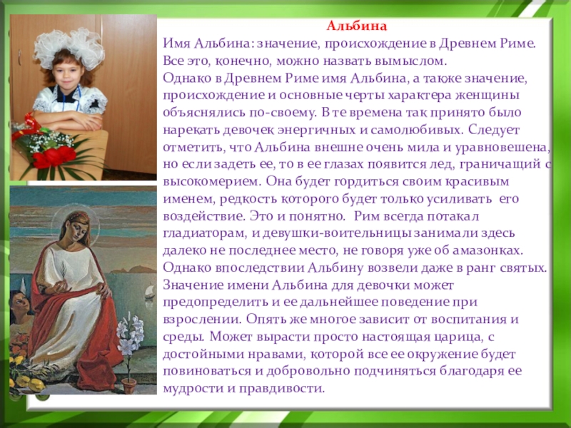 Однако в Древнем Риме имя Альбина, а также значение, происхождение и основные черты характера женщины объяснялись по-своему. В те времена так принято было нарекать девочек энергичных и самолюбивых. Следует отметить, что Альбина внешне очень мила и уравновешена, но если задеть ее, то в ее глазах появится лед, граничащий с высокомерием. Она будет гордиться своим красивым именем, редкость которого будет только усиливать его воздействие. Это и понятно. Рим всегда потакал гладиаторам, и девушки-воительницы занимали здесь далеко не последнее место, не говоря уже об амазонках. Однако впоследствии Альбину возвели даже в ранг святых. Значение имени Альбина для девочки может предопределить и ее дальнейшее поведение при взрослении. Опять же многое зависит от воспитания и среды. Может вырасти просто настоящая царица, с достойными нравами, которой все ее окружение будет повиноваться и добровольно подчиняться благодаря ее мудрости и правдивости.
