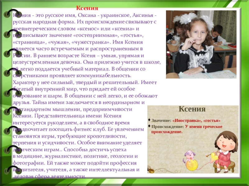 народная форма. Их происхождение связывают с древнегреческим словом «ксенос» или «ксениа» и приписывают значение «гостеприимная», «гостья», «странница», «чужая», «чужестранка». Имя Ксения является часто встречаемым и распространенным в России. В раннем возрасте Ксеня – умная, упрямая и целеустремленная девочка. Она прилежно учится в школе, ей легко поддается учебный материал. В общении со сверстниками проявляет коммуникабельность.