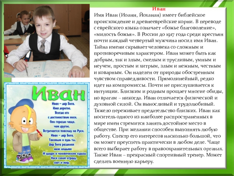 переводе с еврейского языка означает «божье благоволение», «милость божья». В России до 1917 года среди крестьян почти каждый четвертый мужчина носил имя Иван. Тайна имени скрывает человека со сложным и противоречивым характером. Иван может быть как добрым, так и злым, смелым и трусливым, умным и неучем, простым и хитрым, злым и нежным, честным и коварным. Он наделен от природы обостренным чувством справедливости. Прямолинейный, редко идет на компромиссы. Почти не прислушивается к интуиции. Близким и родным прощает многие обиды, но врагам – никогда. Иван отличается физической и духовной силой. Он выносливый и трудолюбивый. Тяжело переживает предательство близких. Иван как носитель одного из наиболее распространенных в мире имен стремится занять достойное место в обществе. При желании способен выполнять любую работу. Спектр его интересов насколько большой, что он может преуспеть практически в любом деле. Чаще всего выбирает работу в правоохранительных органах. Также Иван – прекрасный спортивный тренер. Может сделать военную карьеру.