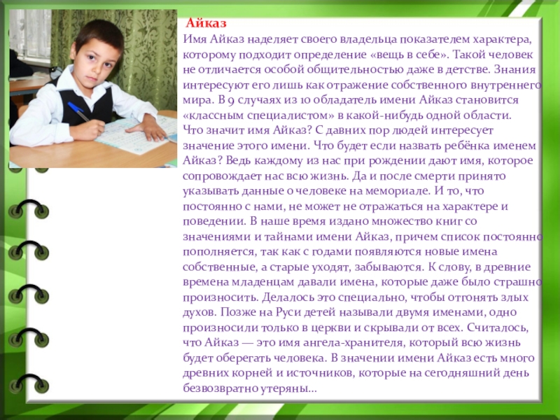 «вещь в себе». Такой человек не отличается особой общительностью даже в детстве. Знания интересуют его лишь как отражение собственного внутреннего мира. В 9 случаях из 10 обладатель имени Айказ становится «классным специалистом» в какой-нибудь одной области.
