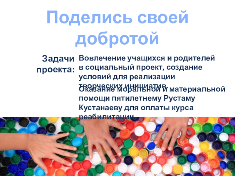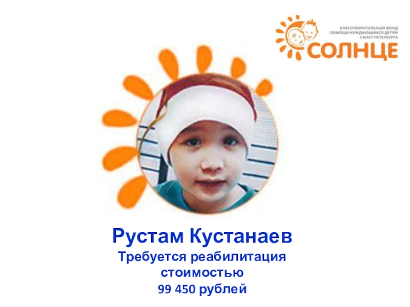 Оказание моральной и материальной помощи пятилетнему Рустаму Кустанаеву для оплаты курса реабилитации.