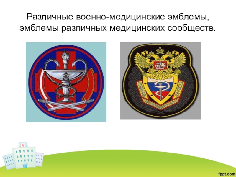 Слайд 16Различные военно-медицинские эмблемы, эмблемы различных медицинских сообществ.