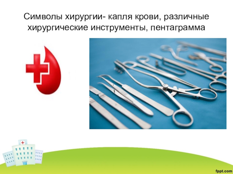 Слайд 15Символы хирургии- капля крови, различные хирургические инструменты, пентаграмма