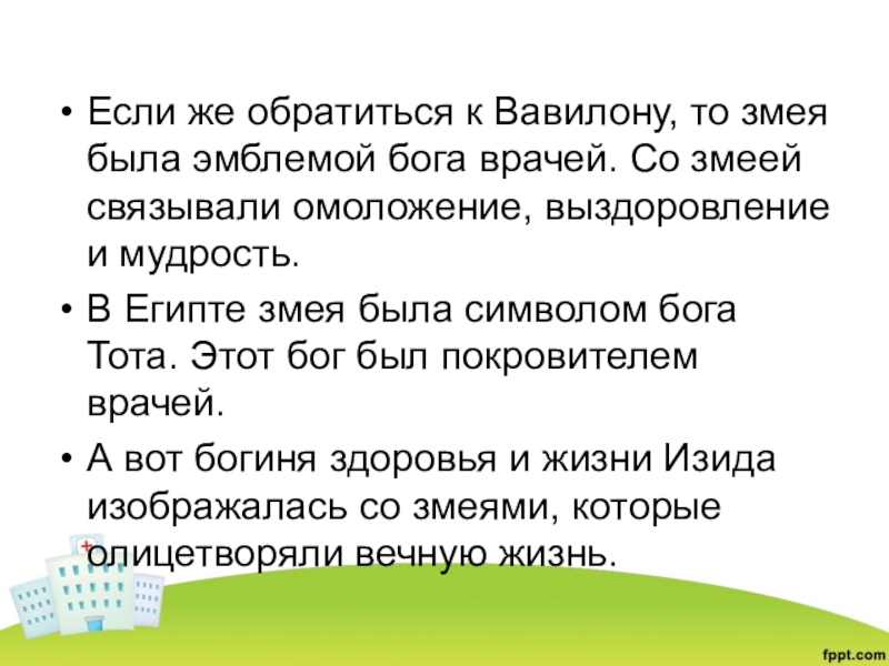 Если же обратиться к Вавилону, то змея была эмблемой бога врачей.