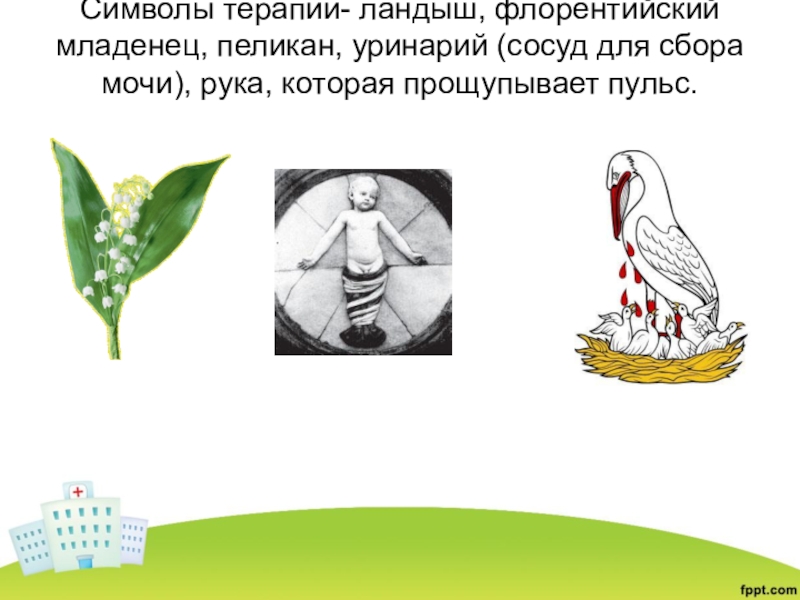 Слайд 13Символы терапии- ландыш, флорентийский младенец, пеликан, уринарий (сосуд для сбора мочи),