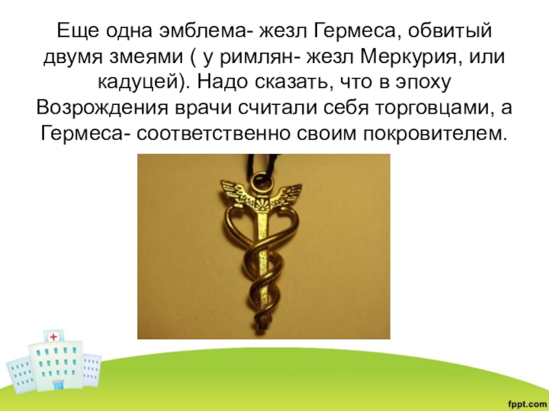 Слайд 26Еще одна эмблема- жезл Гермеса, обвитый двумя змеями ( у римлян-