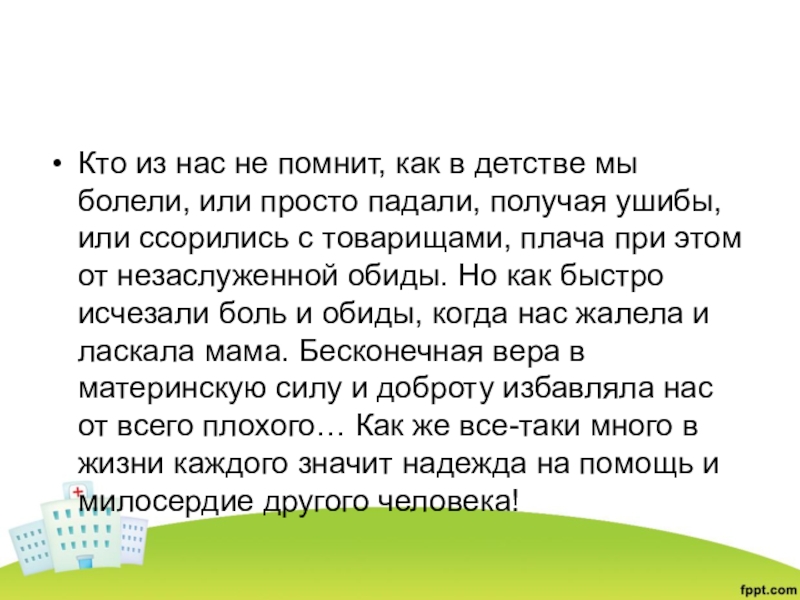 просто падали, получая ушибы, или ссорились с товарищами, плача при этом от незаслуженной обиды. Но как быстро исчезали боль и обиды, когда нас жалела и ласкала мама. Бесконечная вера в материнскую силу и доброту избавляла нас от всего плохого… Как же все-таки много в жизни каждого значит надежда на помощь и милосердие другого человека!