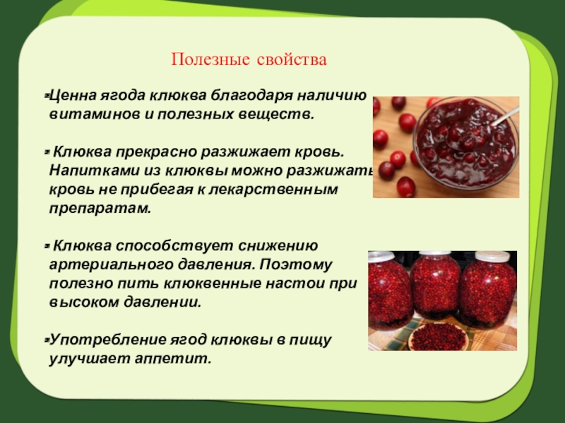 Клюква способствует снижению артериального давления. Поэтому полезно пить клюквенные настои при высоком давлении.
