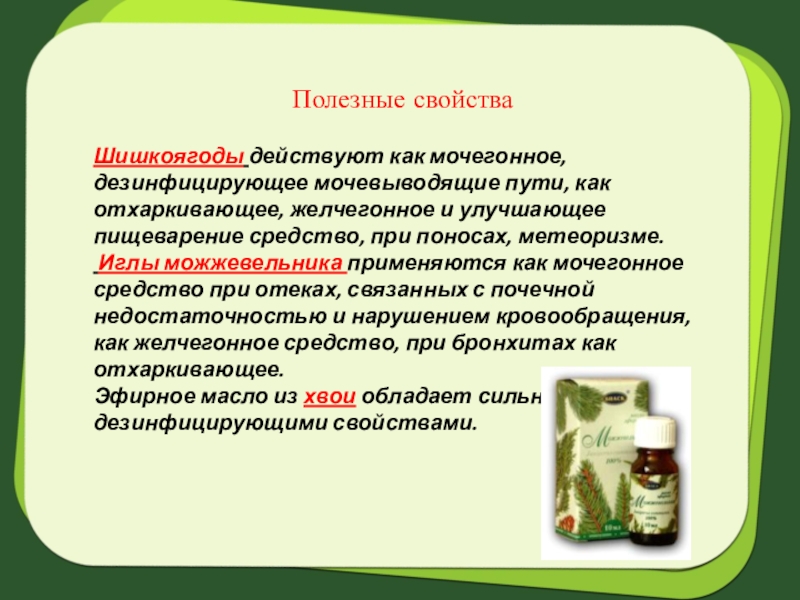 Слайд 12Шишкоягоды действуют как мочегонное, дезинфицирующее мочевыводящие пути, как отхаркивающее, желчегонное и
