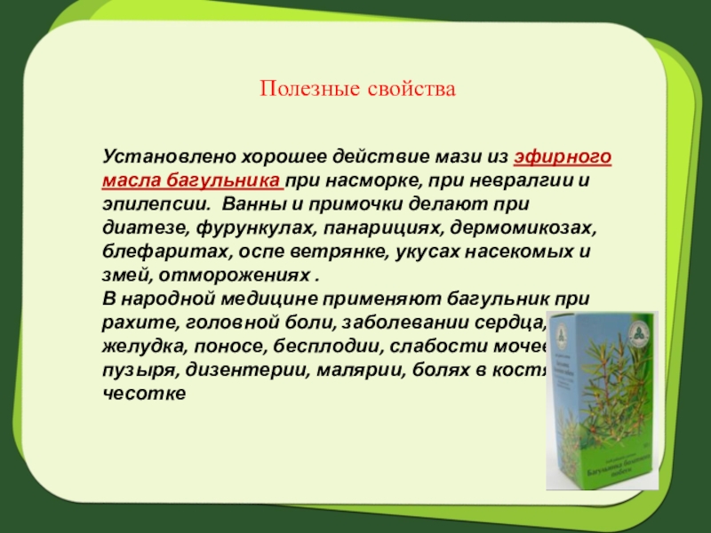 Отвар багульника употребляется при заболеваниях легких, в том числе и туберкулезе, желудочно-кишечных заболеваниях, ревматизме, заболеваниях почек, золотухе, экземе, подагре, а также для профилактики эпидемических заболеваний в качестве противосудорожного средства при грудной жабе, кожных болезнях, ушибах, ранах и кровотечениях.