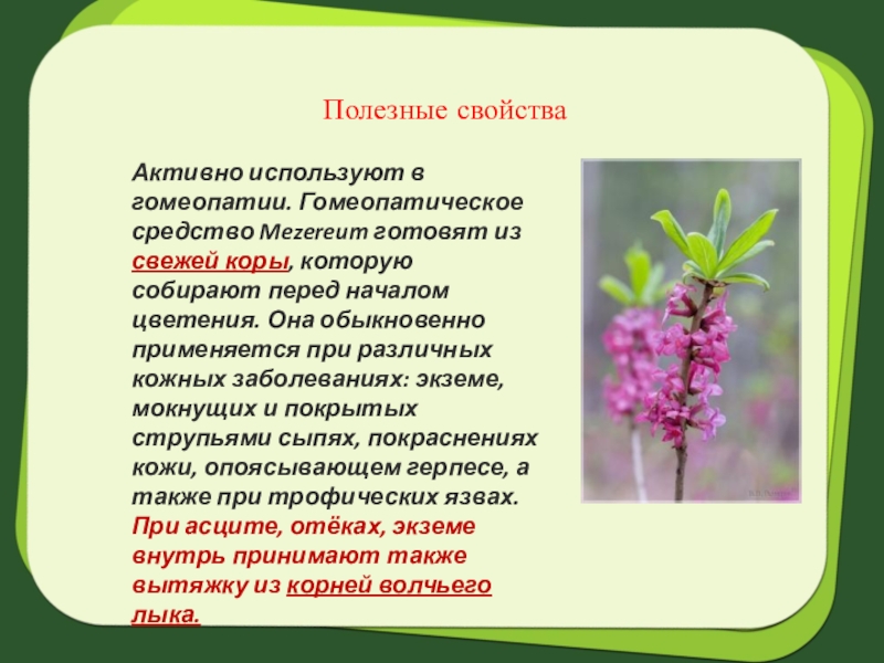 Активно используют в гомеопатии. Гомеопатическое средство Mezereum готовят из